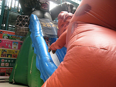 Me and my dad sliding down a slide with King Kong and a dinosaur.