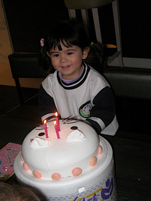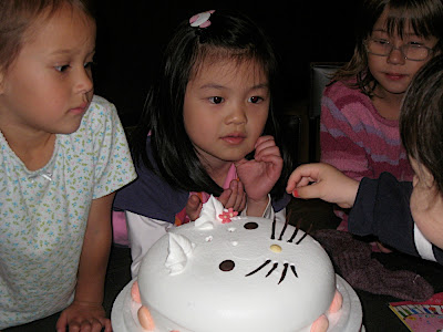 Here are some photos from our play date on Tuesday. My mom got a Hello Kitty cake and everyone sang Happy Birthday to me. I told my mom that I wasn't going to sing because it was my birthday so others were supposed to sing to me. I am now 99 centimeters tall and about 14 kilograms.